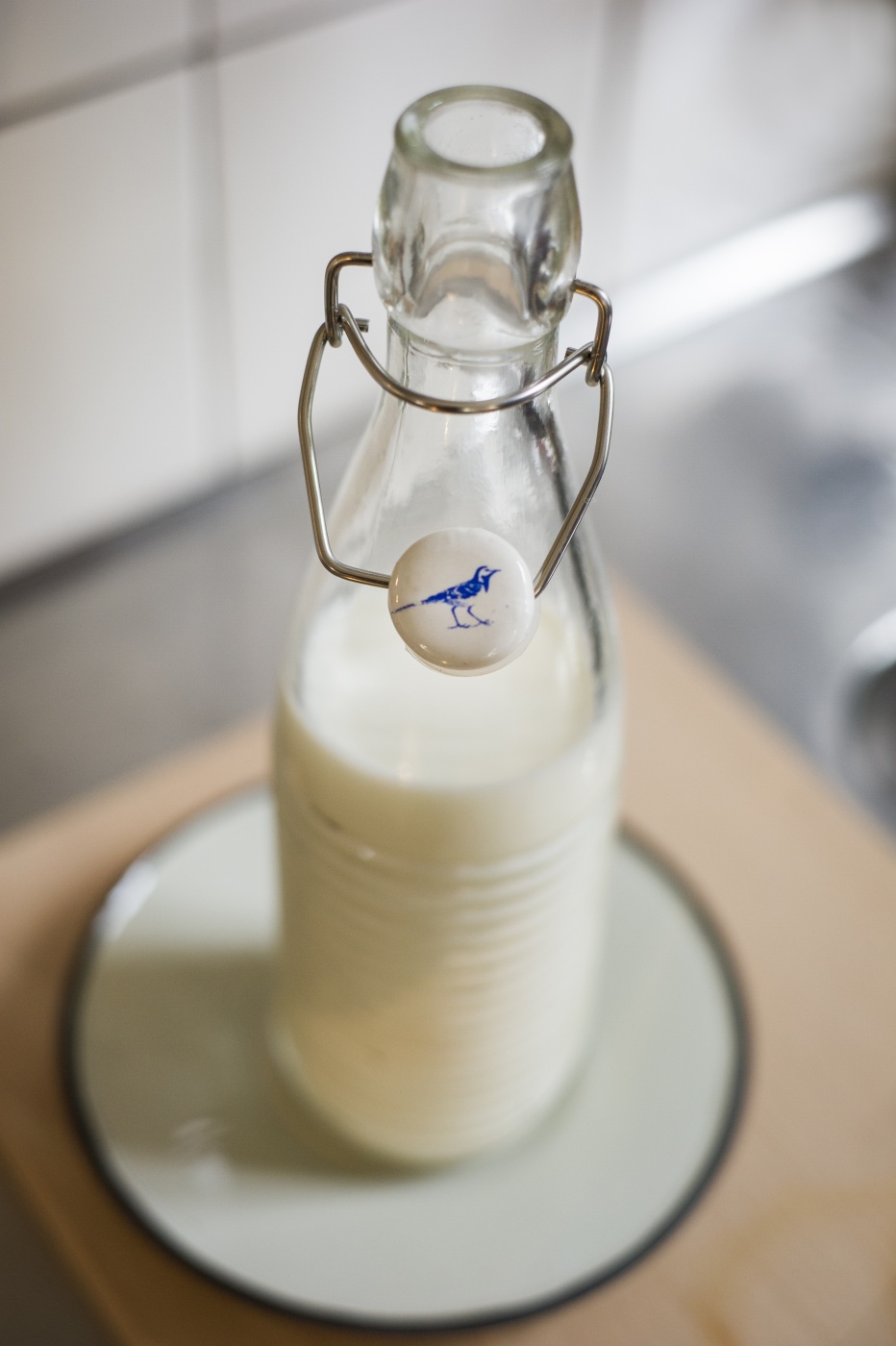 Glass bottle 27cm high. Lid is made in porcelain and with a bird printed on the top.