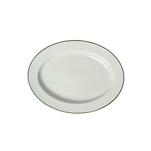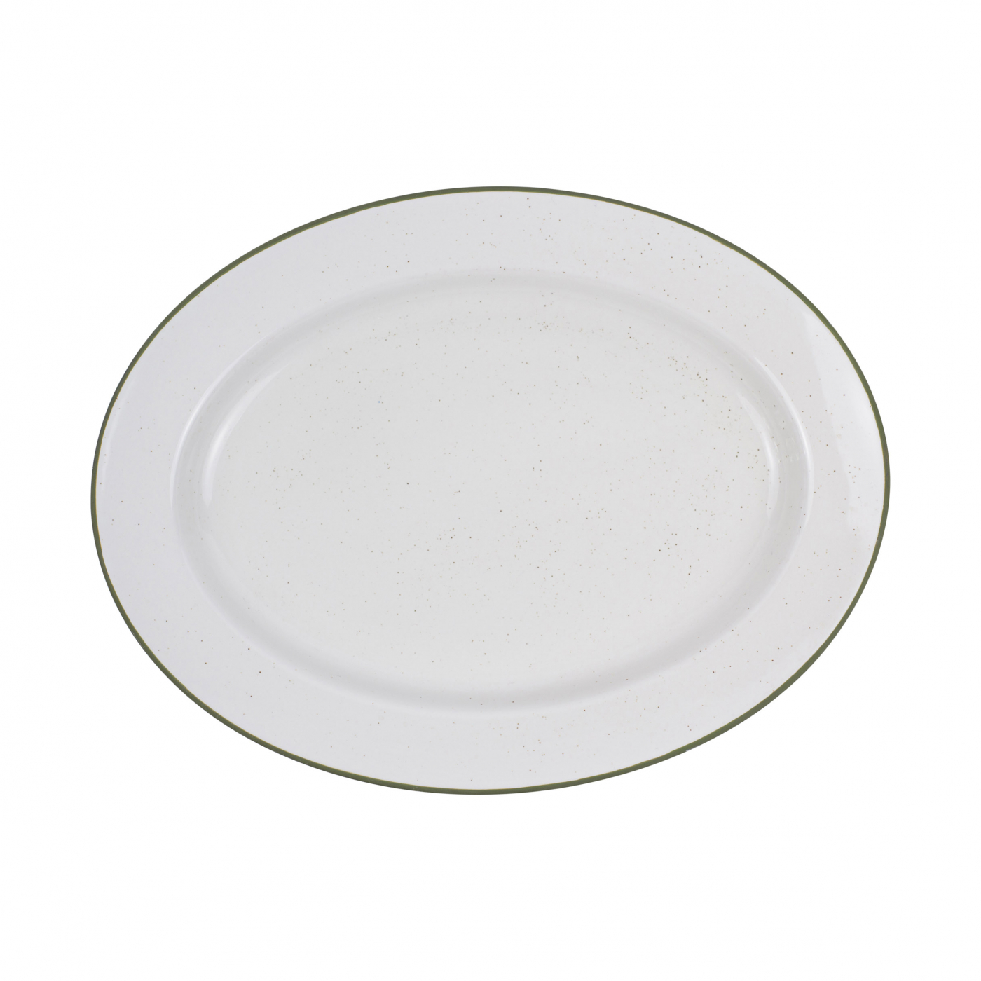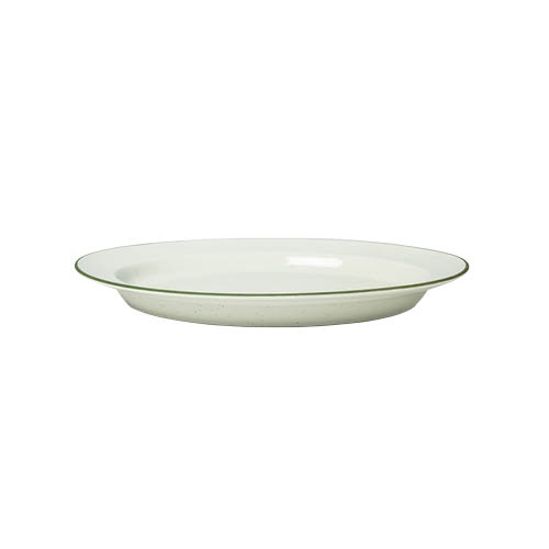Small Platter Oval 37 x 28cm cm oval form. Produced in hard paste porcelain. Hand painted edgings. Line color green. Microwave and dishwasher safe.